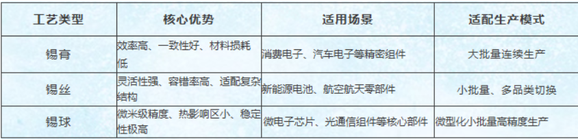 深耕行業(yè)多年,我們發(fā)現(xiàn):企業(yè)在激光焊接工藝選型時(shí),常陷入“試錯(cuò)成本高、適配性差”的困境。為此,我們整合核心技術(shù)資源,推出錫膏、錫絲、錫球三大激光焊接工藝,并整理出完整的選型指南,幫你快速匹配最優(yōu)方案,避開(kāi)選型坑!簡(jiǎn)單來(lái)說(shuō):大批量標(biāo)準(zhǔn)件選錫膏,異形多品種選錫絲,微精高可靠選錫球。下面,先帶大家逐一解鎖...