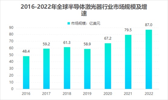 在半導(dǎo)體激光加工應(yīng)用以及中高功率光纖激光器差異需求的推動下,具有中高率、高光束質(zhì)量的半導(dǎo)體激光器快速發(fā)展,半導(dǎo)體激光器也成為光電行業(yè)中最有發(fā)展前景的領(lǐng)域之一。數(shù)據(jù)顯示,全球半導(dǎo)體激光器市場規(guī)模穩(wěn)步提升,2021年全球半導(dǎo)體激光器市場規(guī)模達到79.46億美元,同比增長18.17%。2022年市場規(guī)模約為87.0億美元。